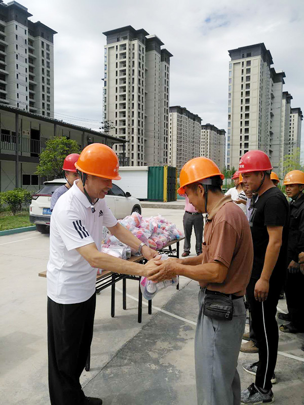 8月31日上午,烈日當空,驕陽似火。市住房城鄉建設局副局長蔣金松、法規處處長呂躍華、施工管理處呂飛熊處長以及建筑業協會麻秘書長等單位領導,冒著酷暑來到我公司市人民醫院東城院區項目,向工人們送去防暑降溫藥品、飲品,慰問工作在第一線的管理人員和民工,開展夏季“送清涼、送法律、送安全”活動。讓廣大一線工人們在炎炎夏日感受到深深涼意。